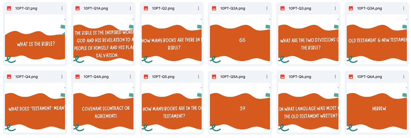 All JBQ questions come from a resource called the Bible Fact Pak. We recommend that leaders purchase a copy of the Bible Fact Pak question book to work through with quizzers. Coaches/Leaders can also create a free account on the Bible Fact Pak website to generate question sets to practice quizzing against each other. All of the questions have also been made available on Quizlet to help study, quiz, practice, etc. Links to all of those resources can be found below!JBQ Practice Ideas & Tips